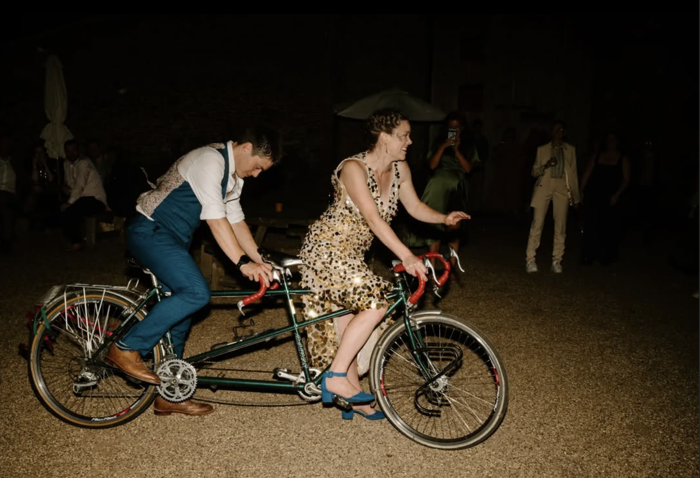 In true Fiona and Jeremy style, the fun didn’t stop there. Their good friend surprised them with a tandem bike, which they promptly rode around in their wedding outfits, grinning from ear to ear. Guests joined the celebration with glitter, temporary tattoos, and a packed dance floor that kept the party going late into the night.
